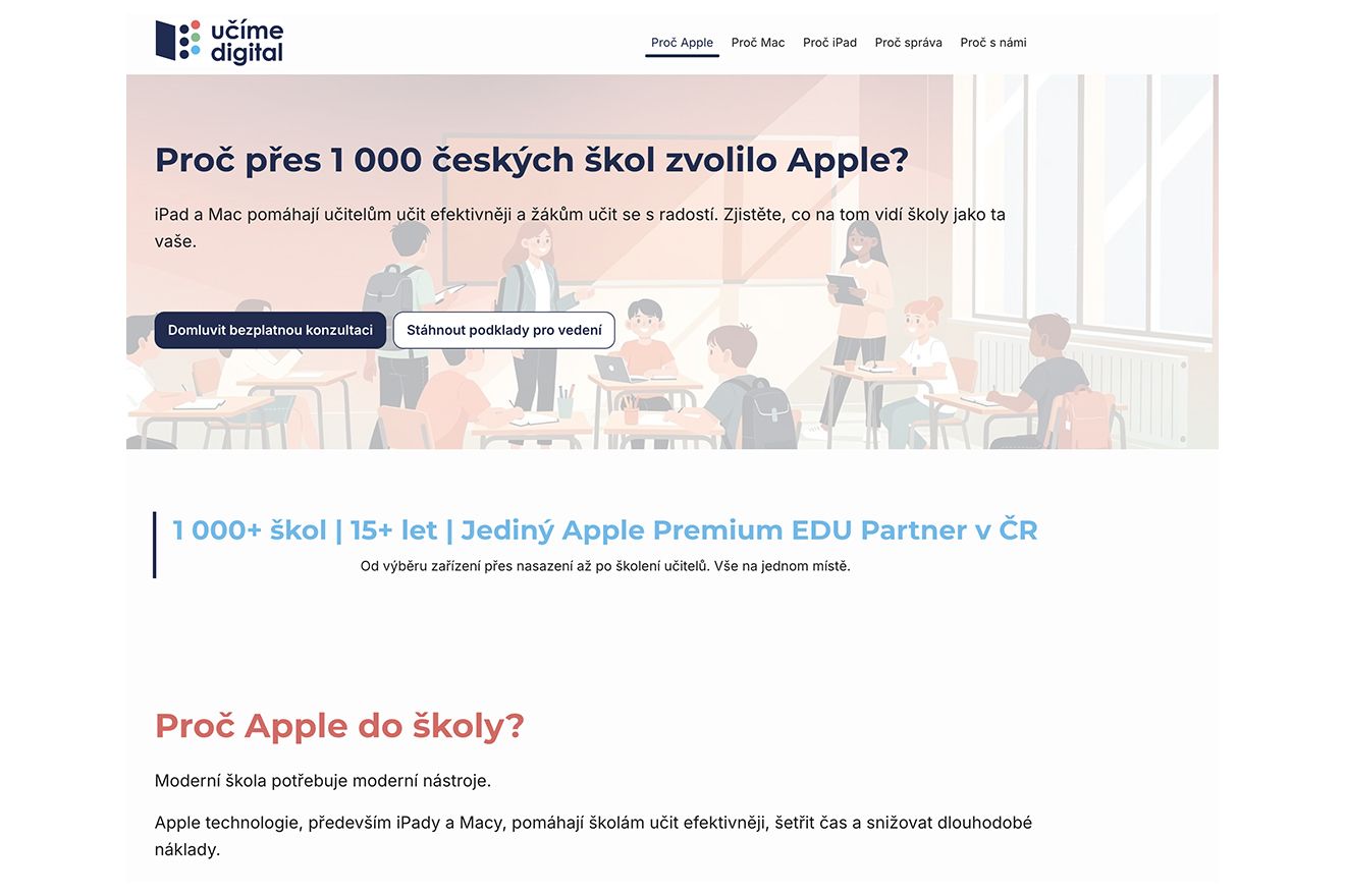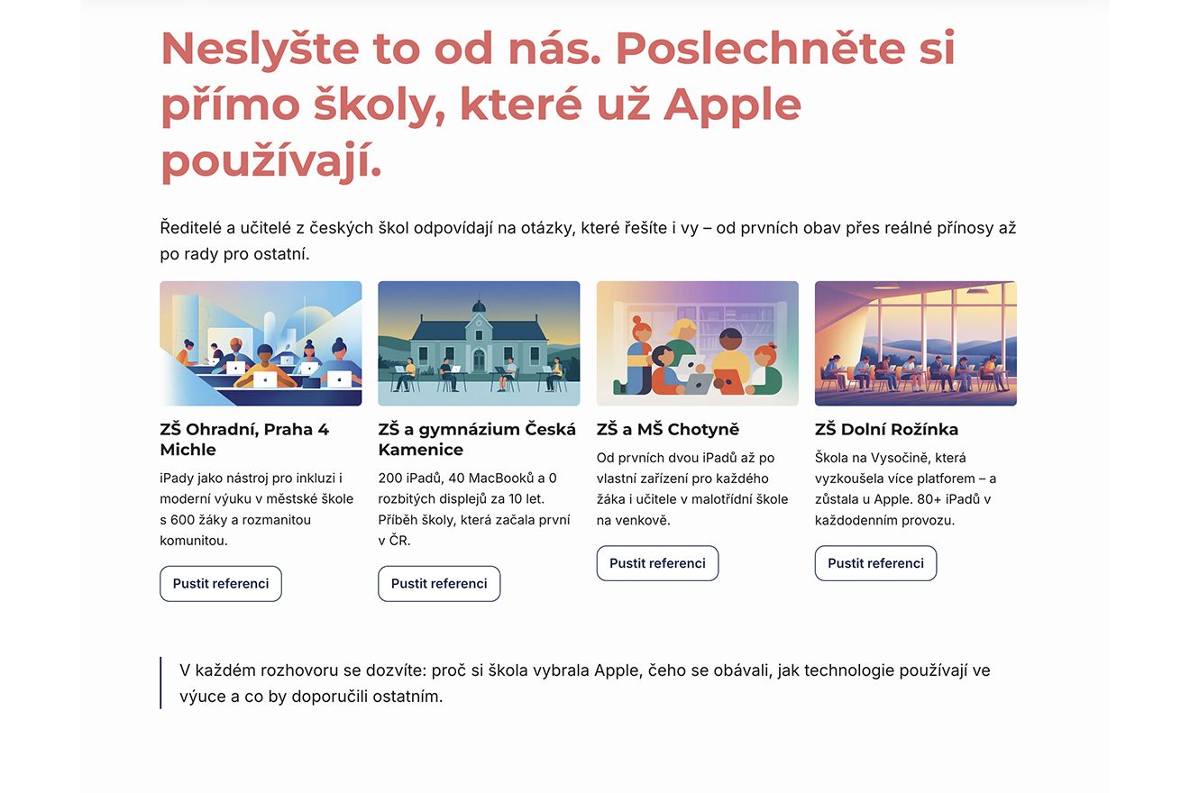 Za posledních 15 let jsme pomohli více než tisícovce českých škol zavést iPady a Macy do výuky. Jejich zkušenosti jsme shrnuli na novém webu modernivyuka.digital, kde najdete vše potřebné pro informované rozhodnutí.