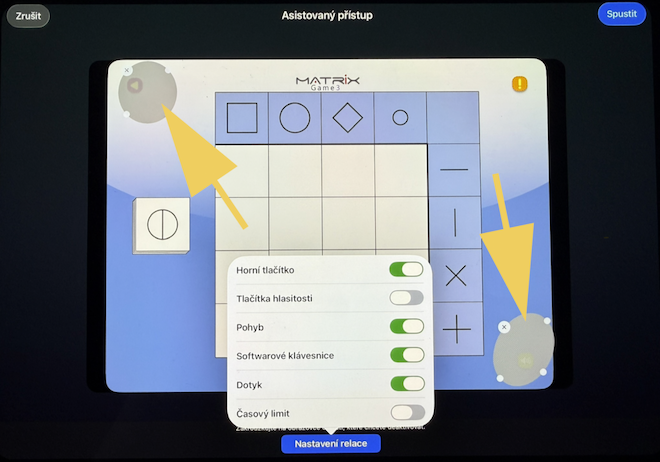 Při zobrazení nabídky Asistovaného přístupu můžete ještě zakroužkováním na obrazovce deaktivovat oblasti, které potřebujete mít neaktivní. Například: návrat do menu, úpravu hlasitosti, překliknutí na webové stránky a podobně. Tyto oblasti budou při práci viditelné, ale nebudou reagovat.