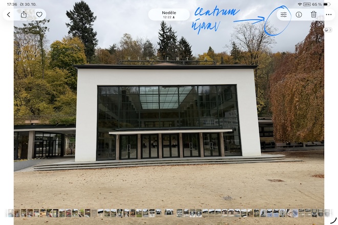 Máme vybraný snímek a hledáme Centrum úprav. Vypadá to jako notová osnava se třemi linkami v pravém horním rohu. Máme? Klikněte a vyberte hrot tužky. Zdola vám vyjede anotační centrum. A už můžete vybírat z anotačních nástrojů. Co je k dispozici?