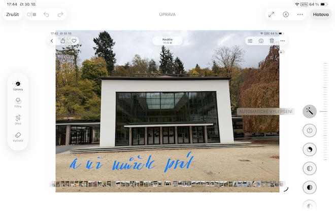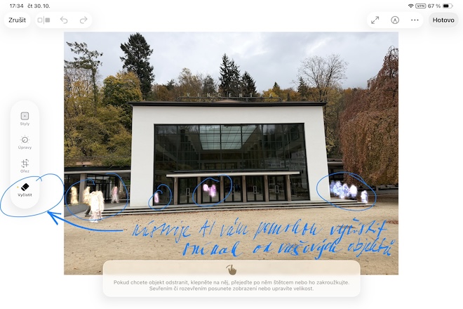 Přidám vám sem ještě možnost vyčistit za pomoci algoritmů snímek např. od lidí – funkce Vyčistit. A níže bude ještě malé video. Pozor, musíte mít v iPadu minimálně čip A17 a novější (M1…). Přece jen ta umělá inteligence vyžaduje nějaký výkon.