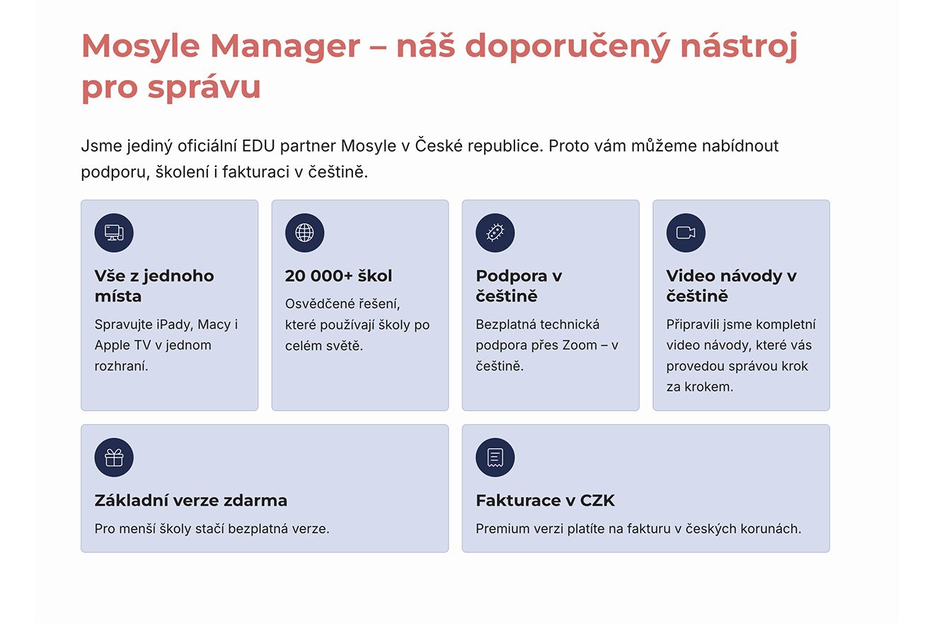 Pro samotnou správu zařízení doporučujeme Mosyle Manager. Jsme jediný oficiální EDU partner Mosyle v republice, takže nabízíme podporu, školení i fakturaci v češtině. Základní verze je zdarma. Premium verze, která se vyplatí při 30 a více iPadech, stojí 150,- za iPad na rok.