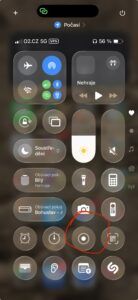 V současném operačním systému jablečné platformy iOS a iPadOS už hledejte rovnou po přetažení prstu z pravého horního rohu zařízení malé bílé kolečko se soustředným bílým kruhem okolo. Pro jistotu vám udělám snímek obrazovky. V současných Ovládacích panelech si nástroje můžete řadit v Oblíbených – označeno srdíčkem, skrolováním nahoru nebo dolů se vám objevují další nástroje podle zaměření (můžete je také potřebovat – je to taková zkratka, abyste se nemuseli prodírat složitým systémem).